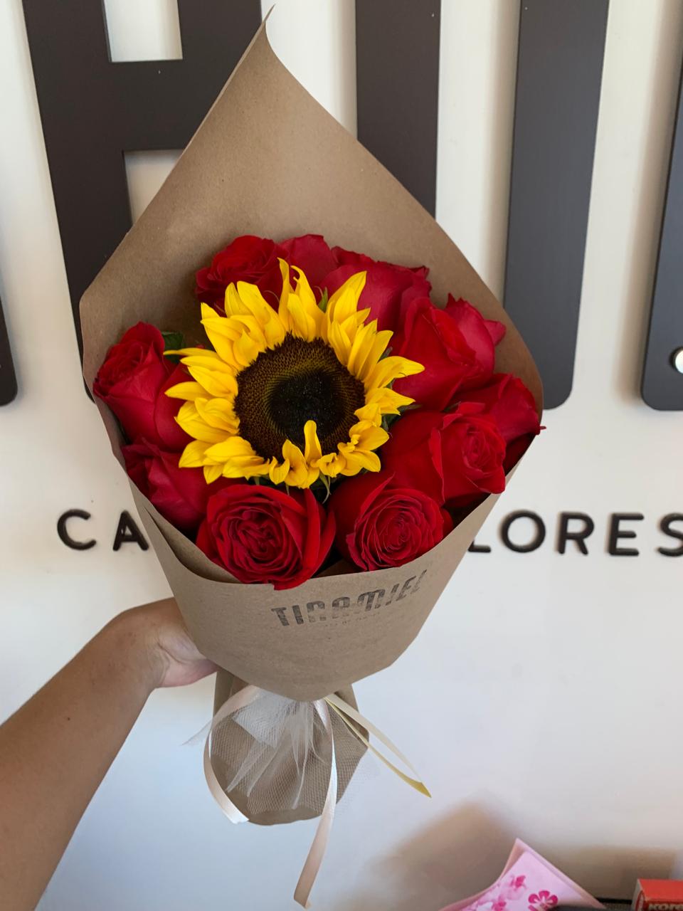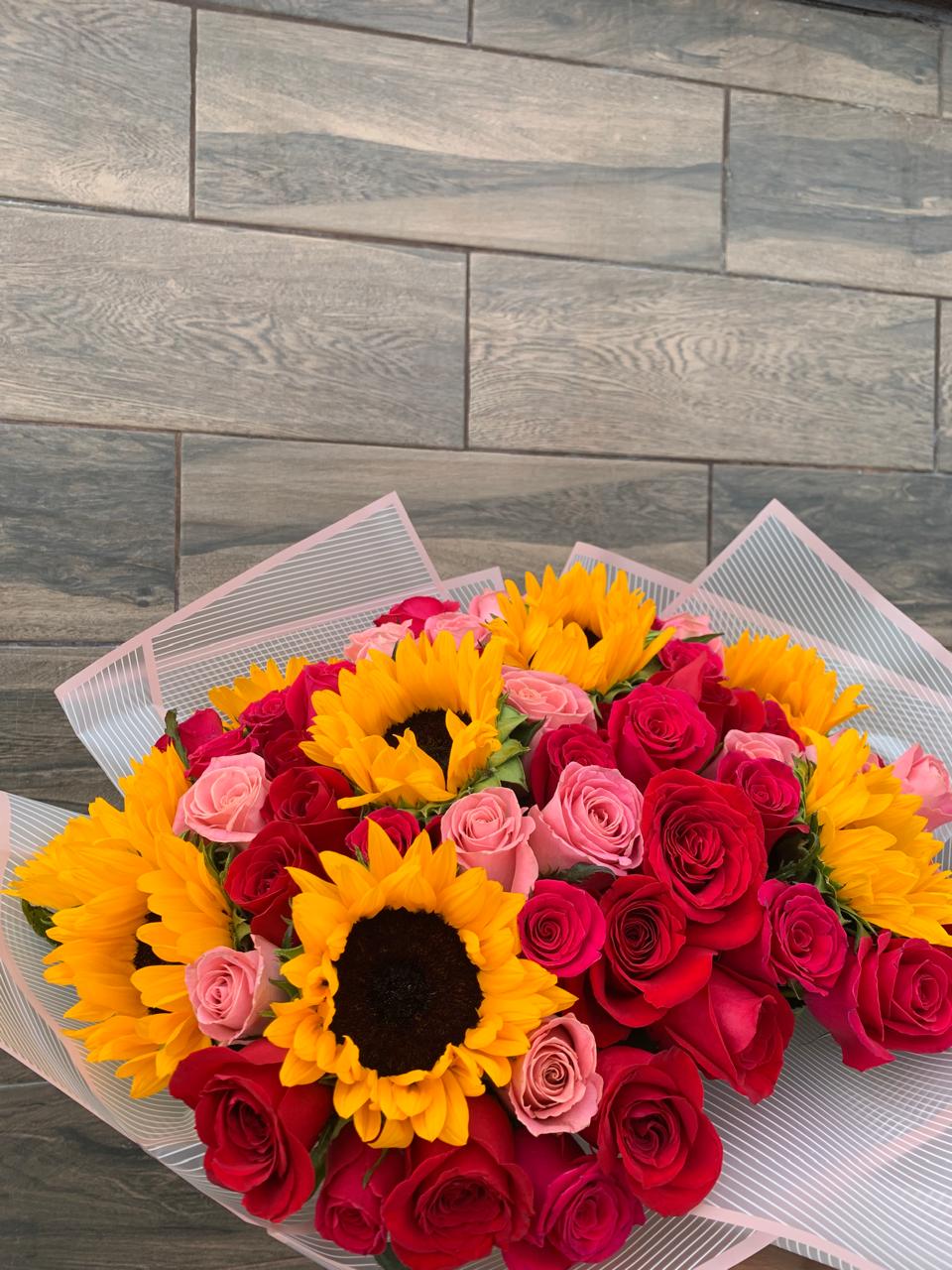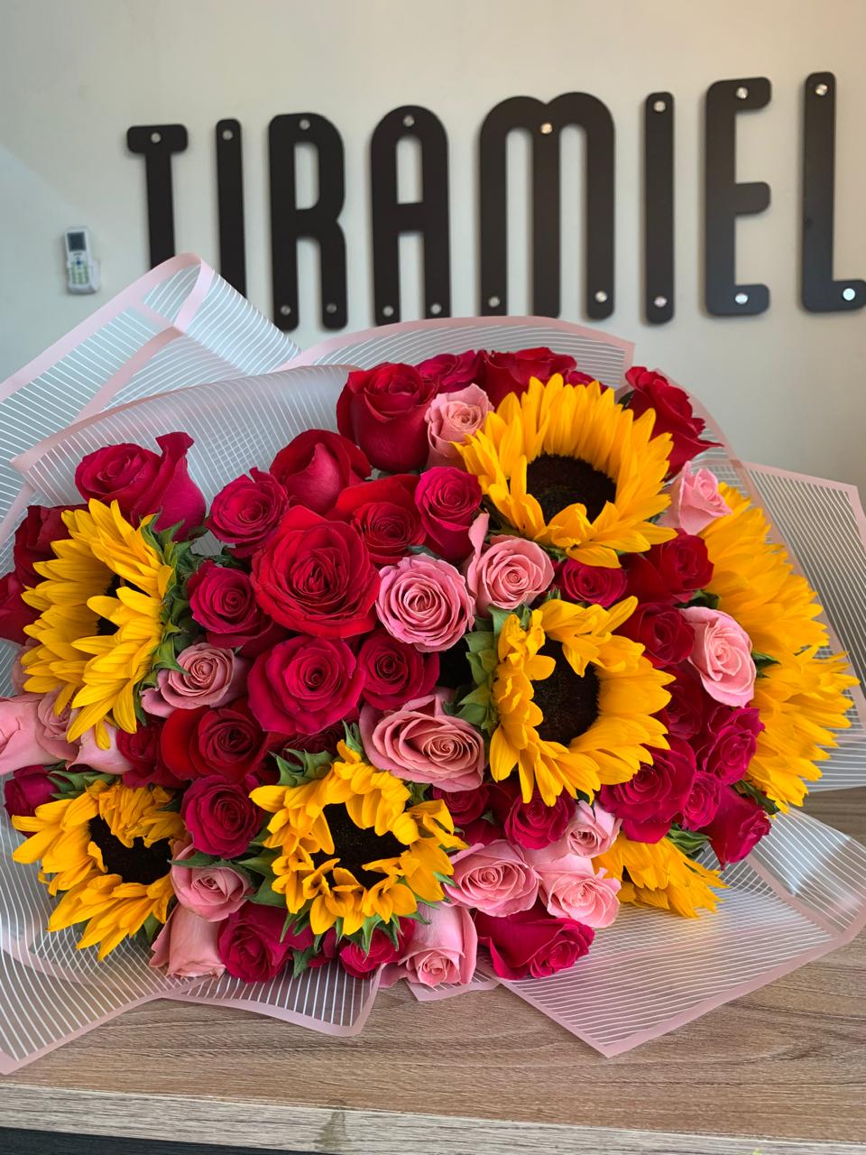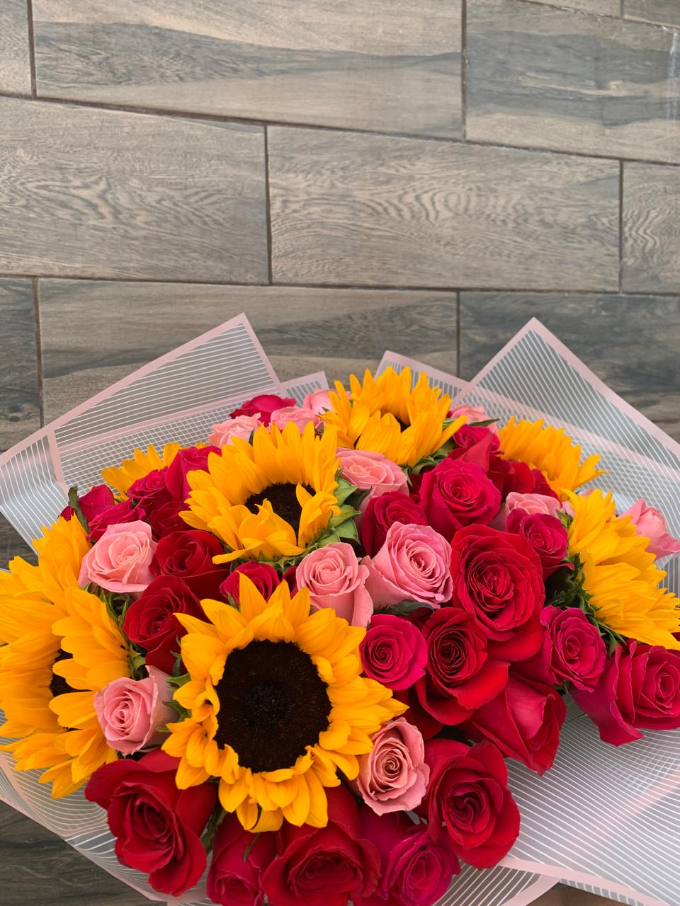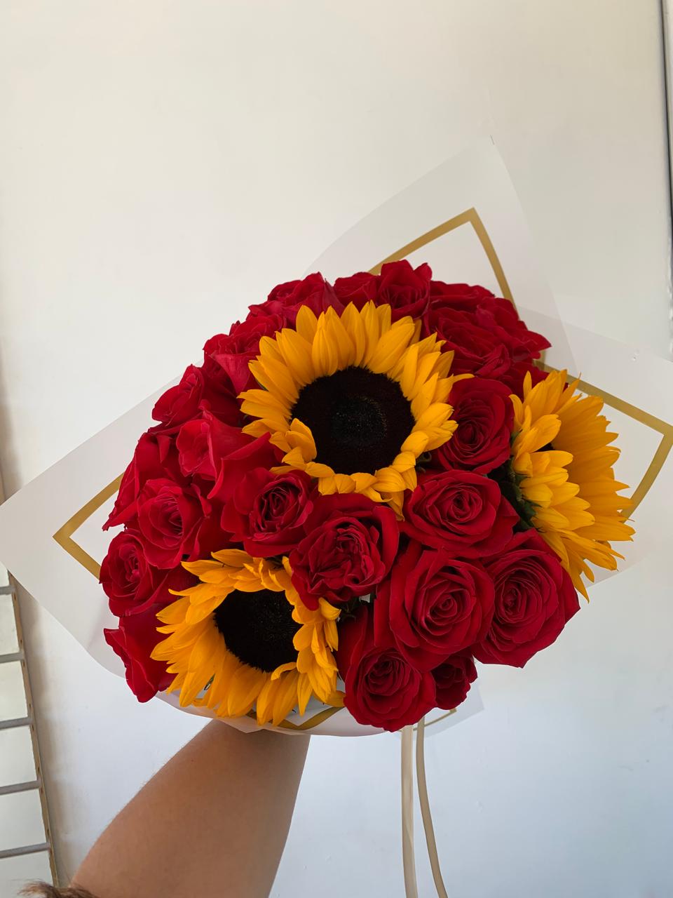 Este ramo combina la calidez de los girasoles con la ternura de las rosas, creando un mensaje claro: "Gracias por ser luz en mis días."