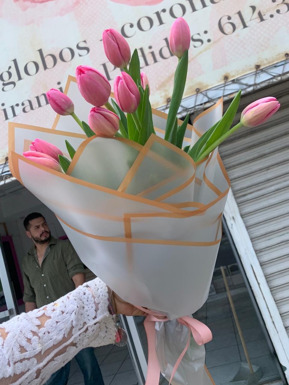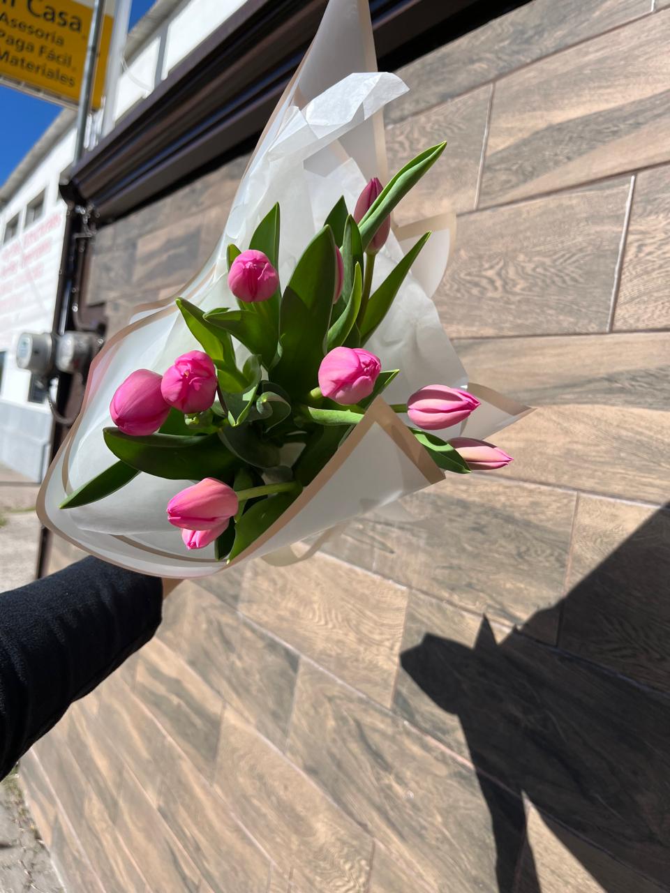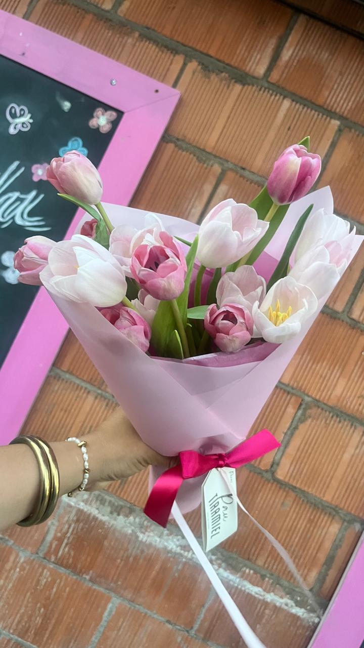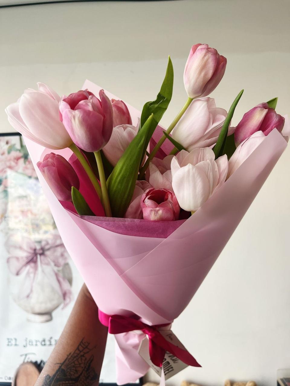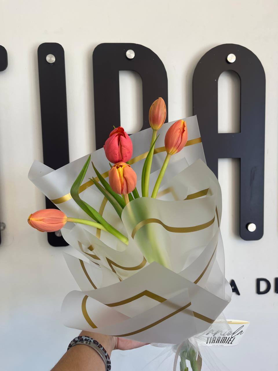 Tulipanes frescos, envueltos en papel coreano a prueba de agua,